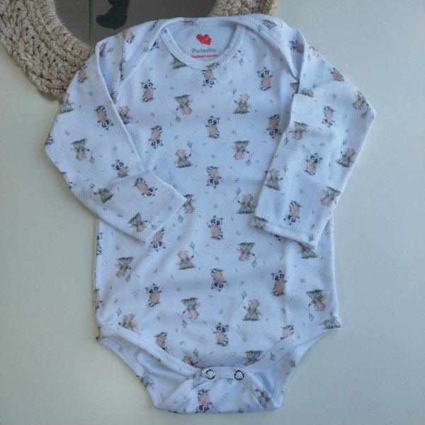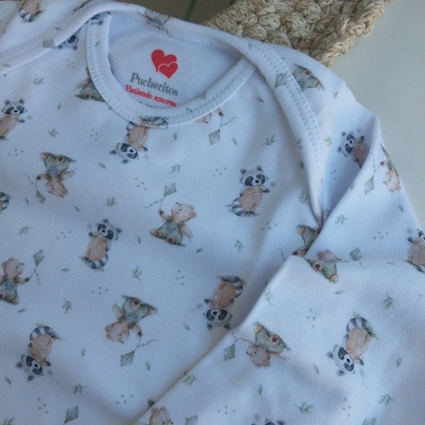 Nuestro body estilo americano “Fede” está confeccionado en suave algodón pima, ideal para cuidar la piel delicada de tu bebé. Su diseño estampado con tiernos ositos y mapaches lo hace aún más especial y adorable.